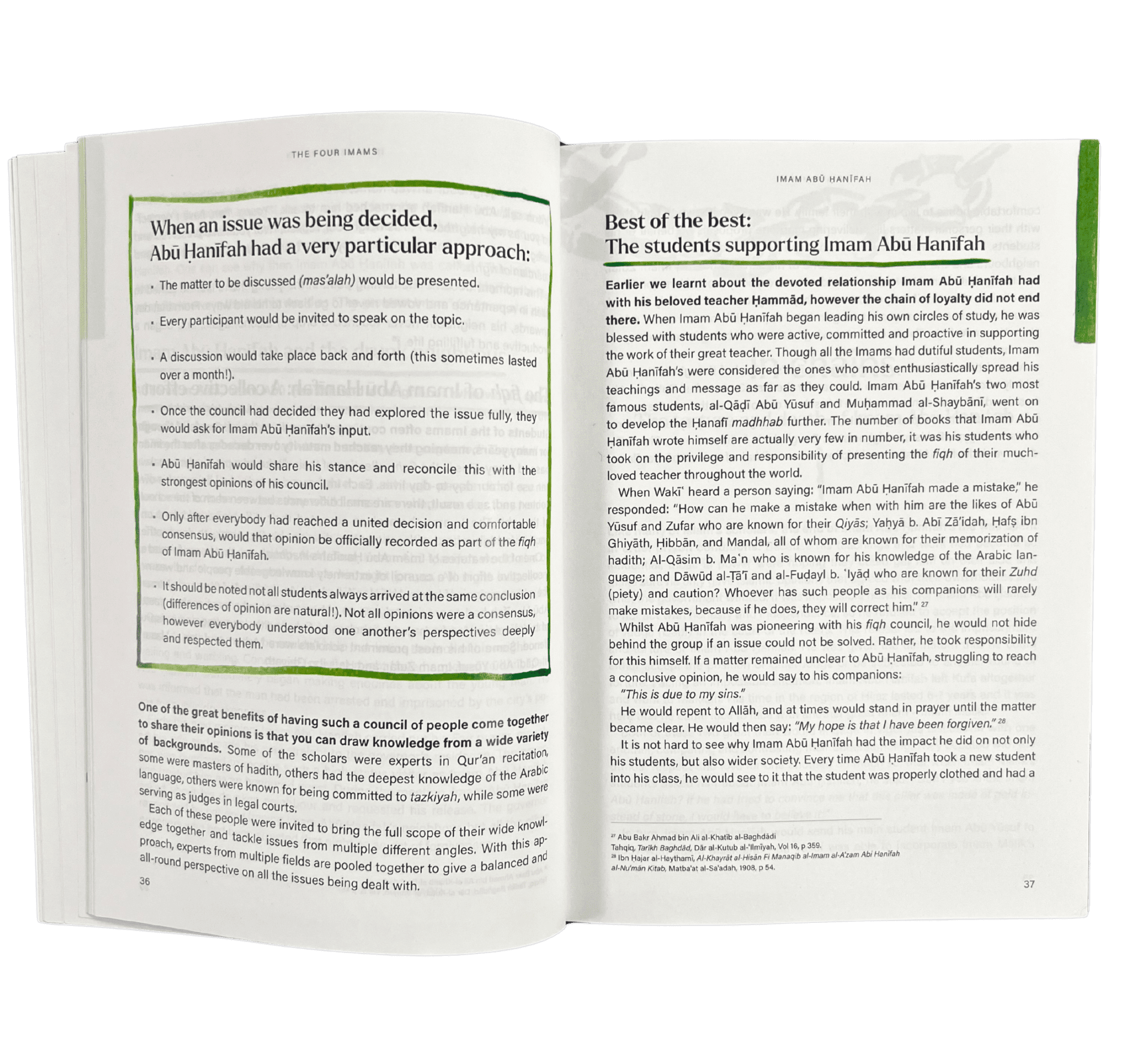 The Four Imams provides an engaging and informative account of the four most well-renowned Imams in Islamic history – Iman Abu Hanifa, Imam Malik, Imam Shafi’i and Imam Ahmad. Adopting a story-telling style, it relays biographical information, summarising their fascinating life journeys, alongside lessons and conclusions that have real-world application for the reader in an age-appropriate manner.